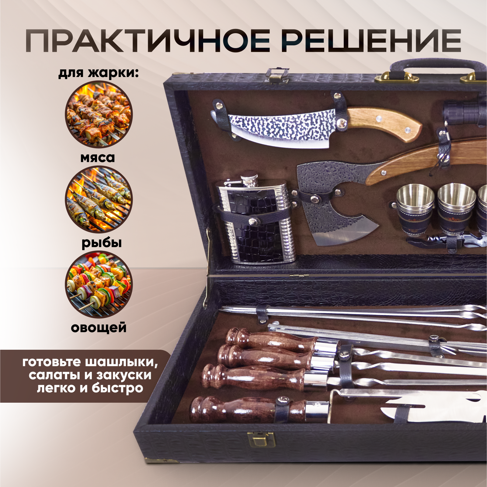 Набор для шашлыка подарочный в кейсе № 26 от GRILLS FACTORY. На 6 персон, с коричневым велюром внутри интересное: