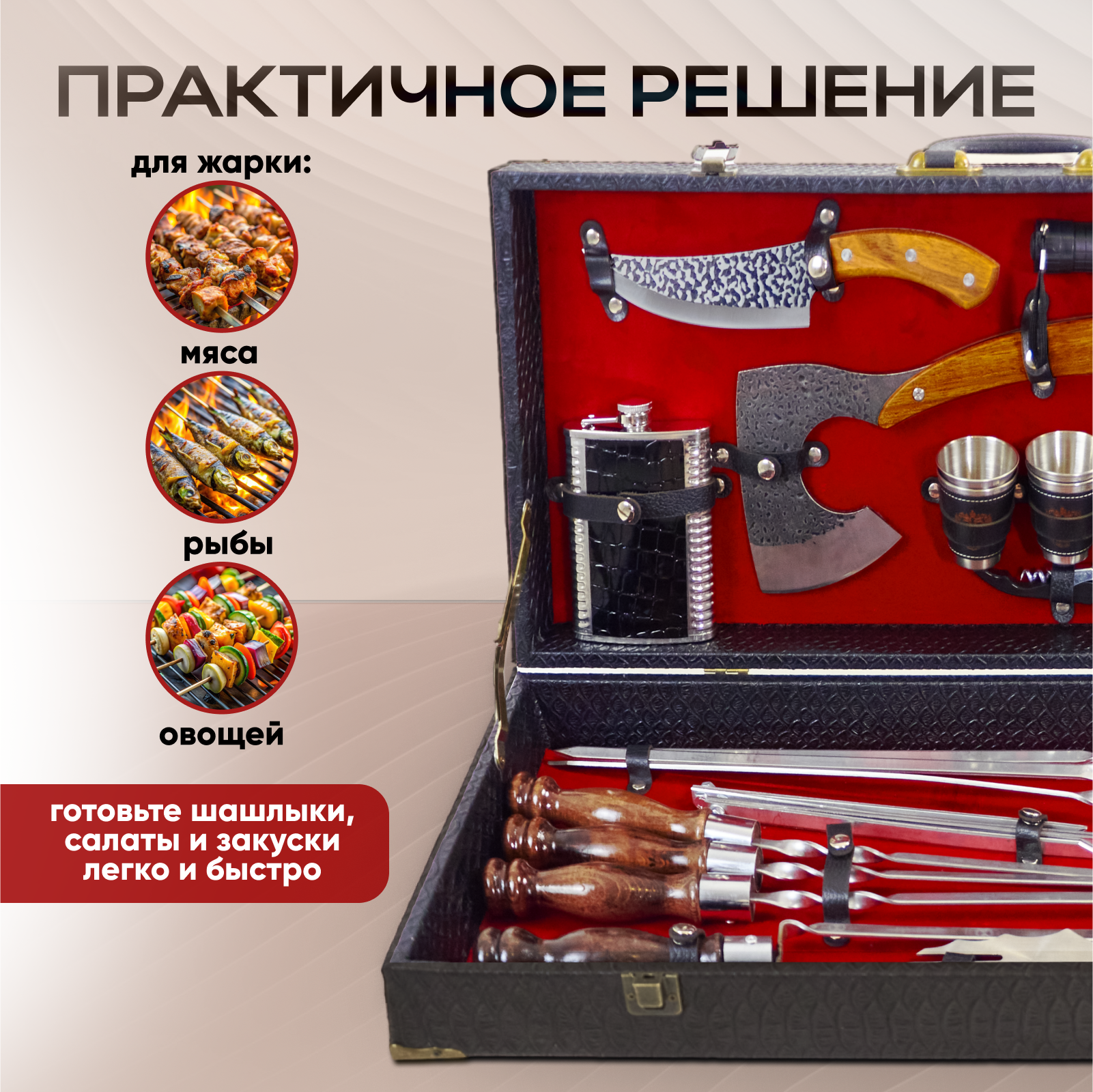 Набор для шашлыка подарочный в кейсе № 26 от GRILLS FACTORY. На 6 персон, с коричневым велюром внутри
