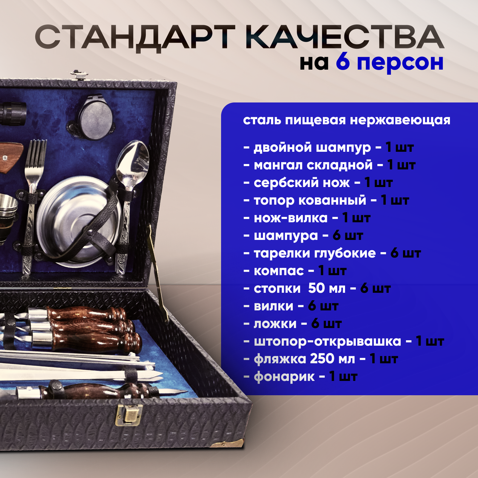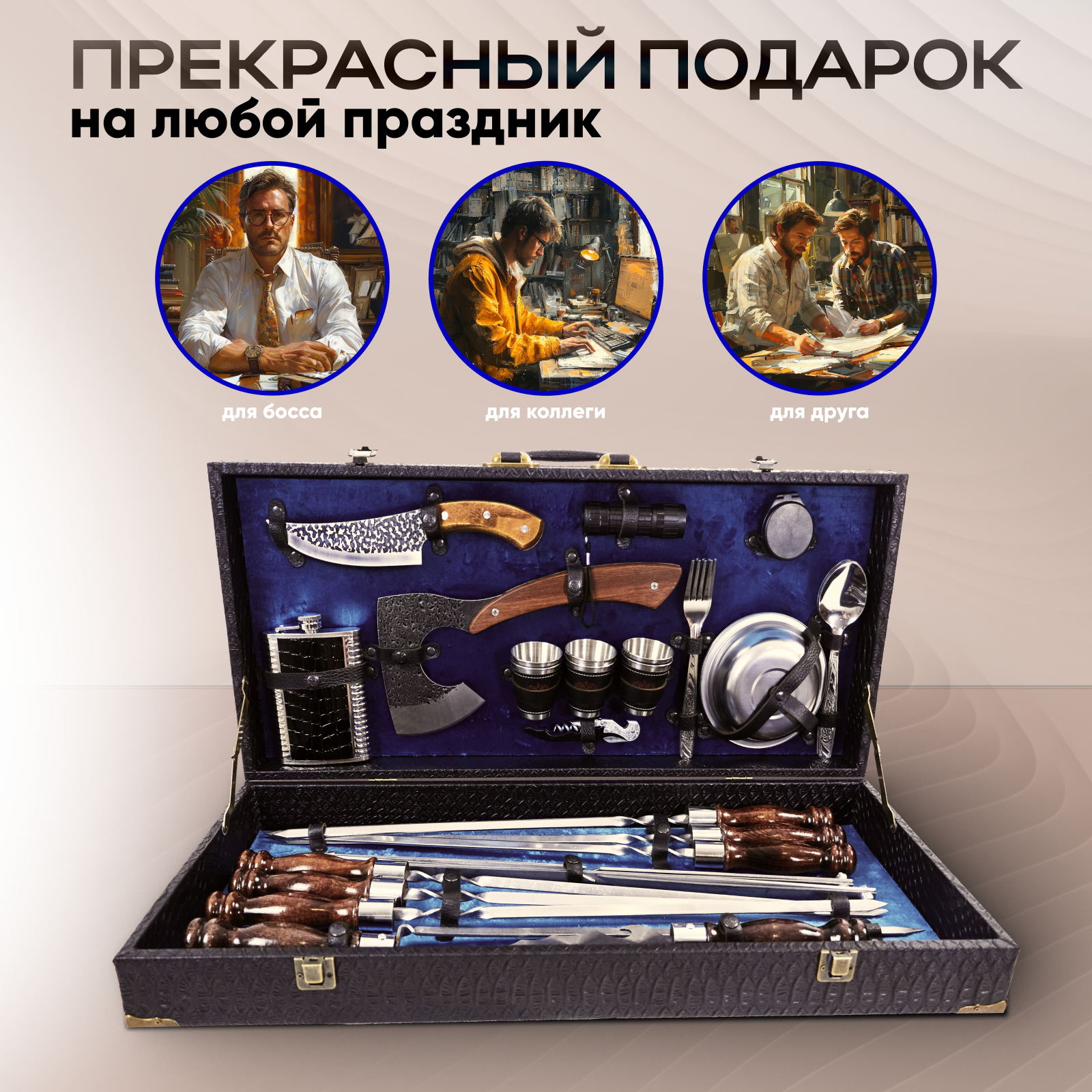Шашлычный набор подарочный в кейсе № 26 от GRILLS FACTORY. На 6 персон, с синим велюром внутри интересное: