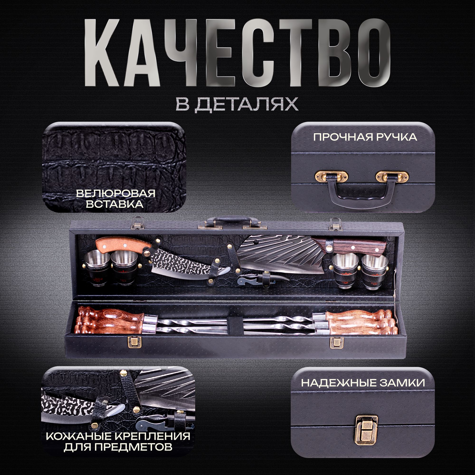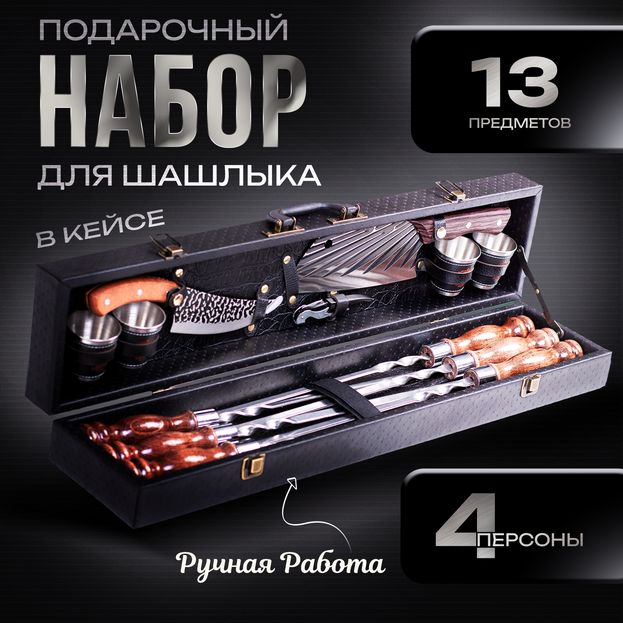 Набор для шашлыка подарочный в кейсе Эстет от GRILLS FACTORY. На 4 персоны, с коричневым велюром внутри