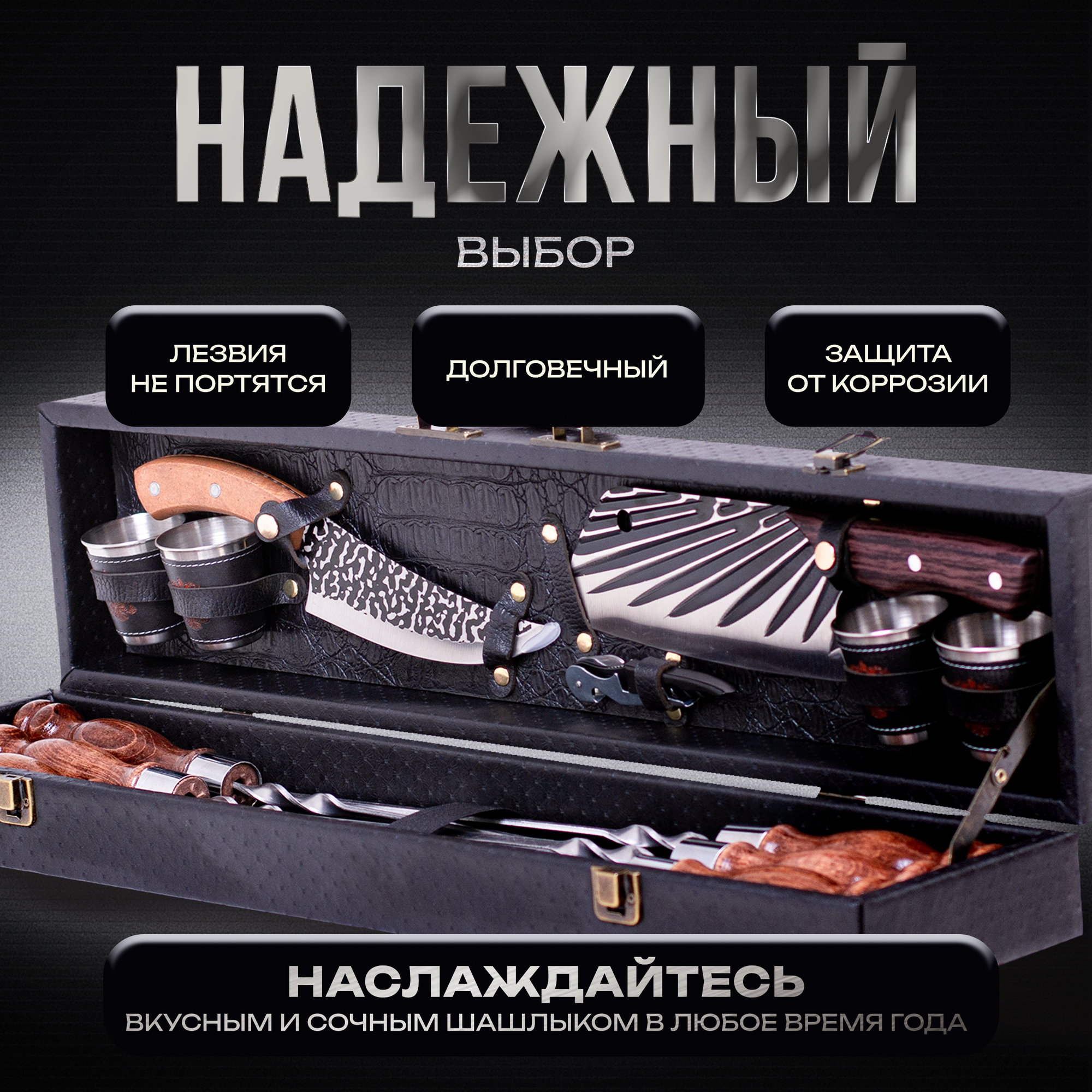 Набор для шашлыка подарочный в кейсе Эстет от GRILLS FACTORY. На 4 персоны, с красным велюром внутри