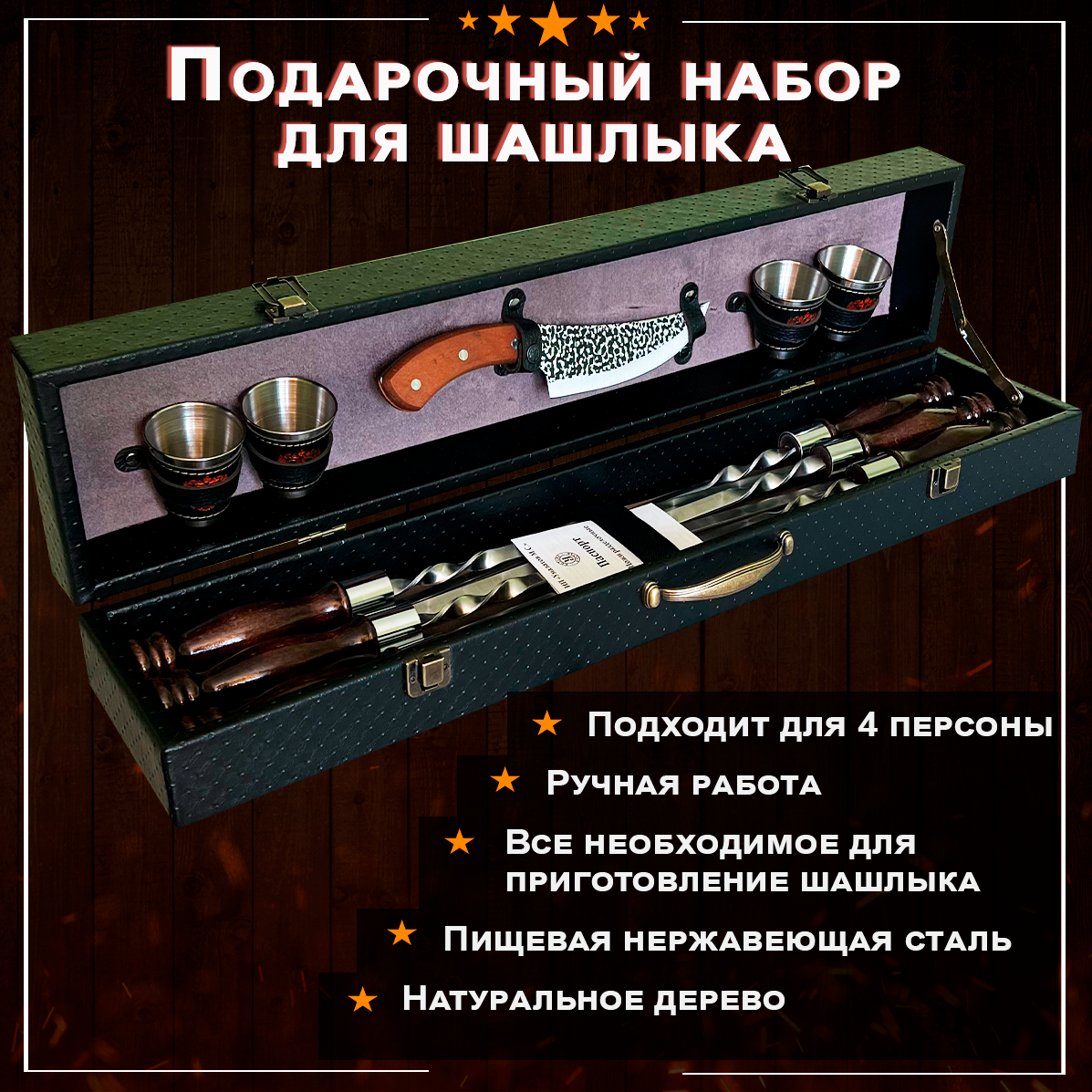 Набор для шашлыка подарочный в кейсе № 25 с сербским ножом от GRILLS FACTORY. На 4 персоны, с коричневым велюром внутри интересное: