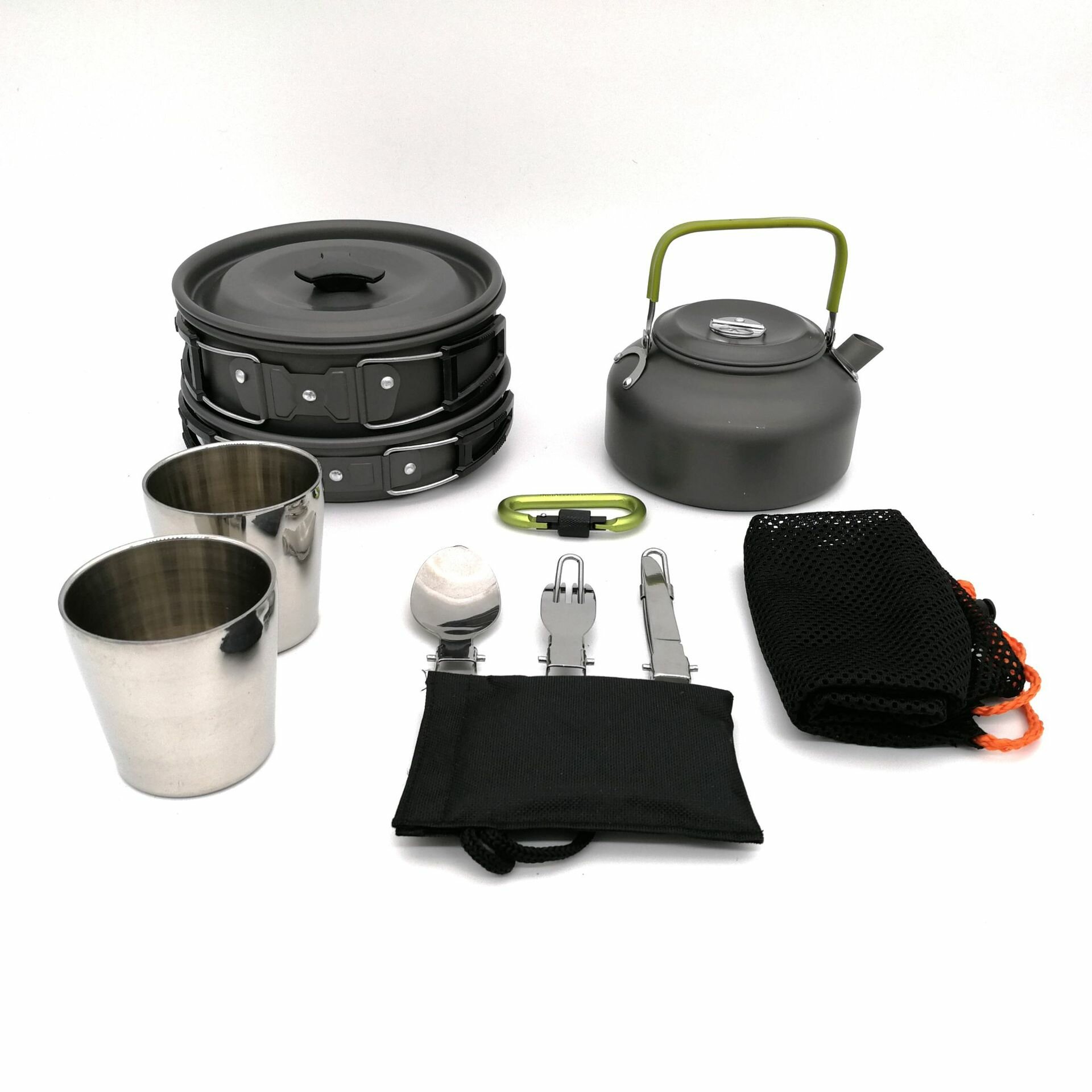 Набор посуды для кемпинга, с термосумкой, 2 кастрюли, чайник, черная и зеленая ручки