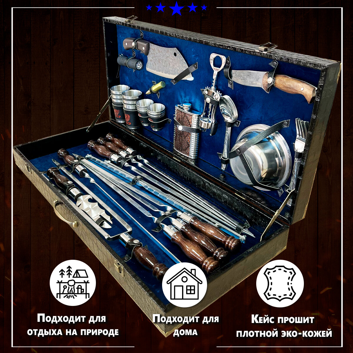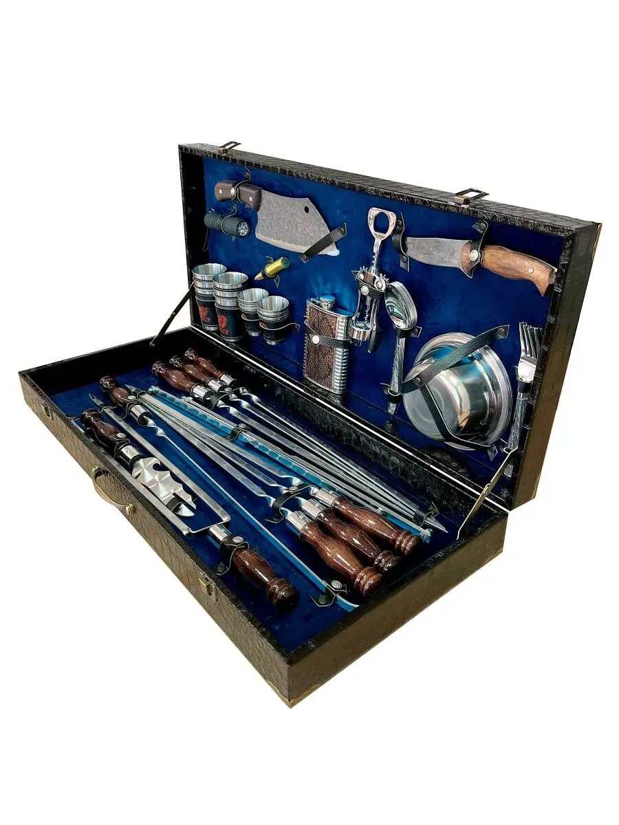 Набор для шашлыка подарочный в кейсе № 16 от GRILLS FACTORY. На 6 персон, с синим велюром внутри интересное: