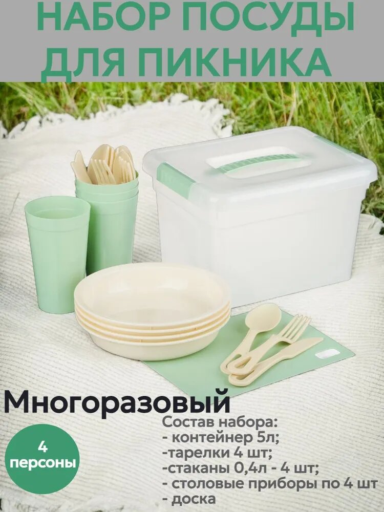 Набор для пикника в контейнере на 4 персоны/ набор посуды для пикника/ посуда для кемпинга/ походный набор посуды интересное: