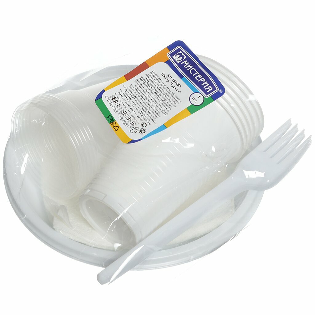 Набор одноразовой посуды на 6 персон, вилки, стаканы 200 мл, стаканы 100 мл, тарелки, салфетки, Мистерия, Турист, 187060 интересное: