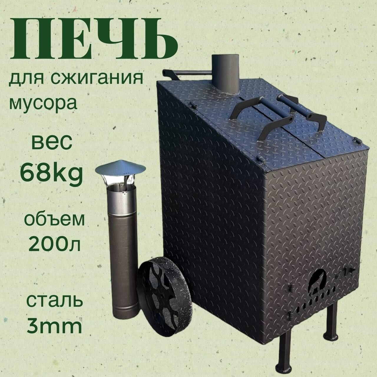 Печь для сжигания мусора 200л квадратная, рифленая сталь 3мм