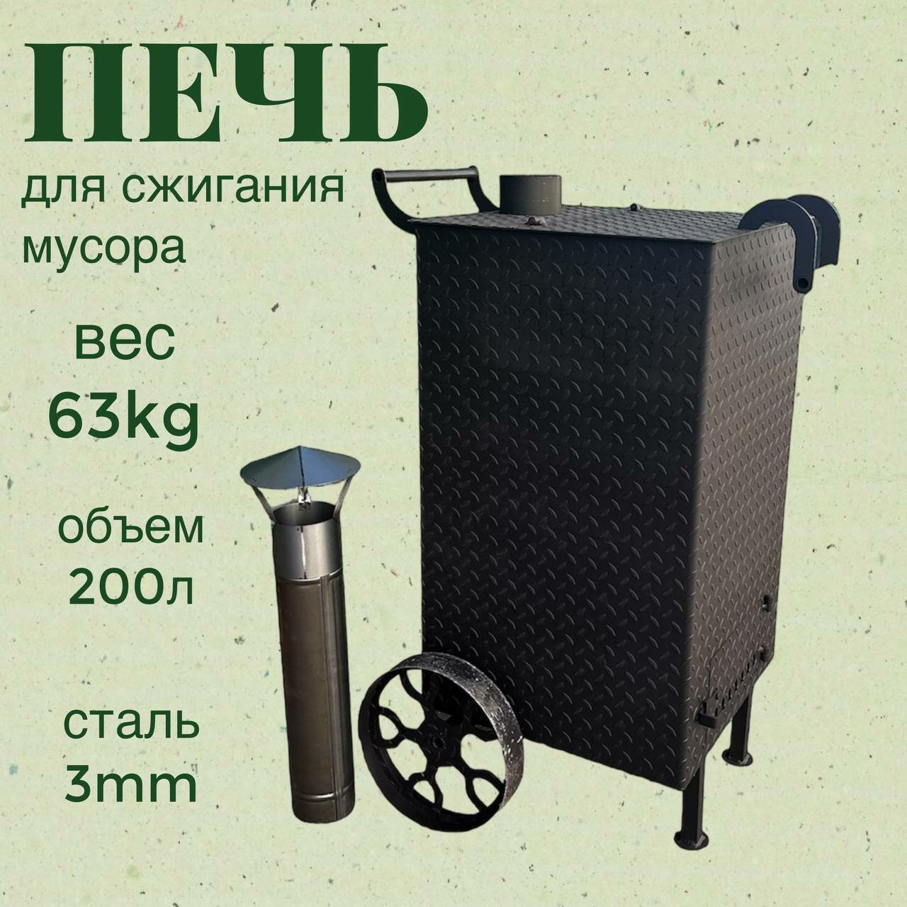 Печь для сжигания мусора, усиленная, 200 л, стальная, дымоход, черный интересное: