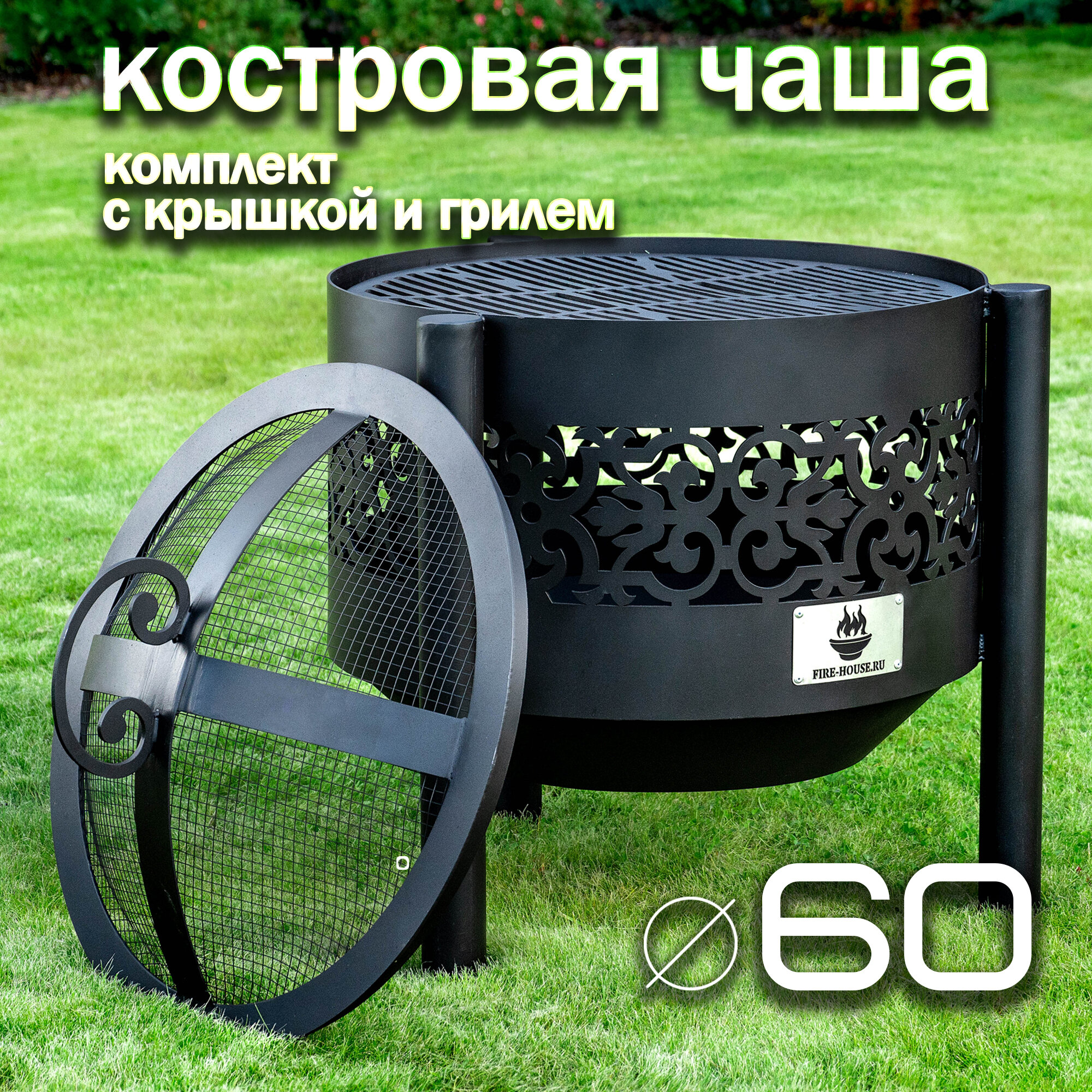 Купить Костровая чаша Ажурная диаметр 60 см с крышкой искрогасителем и решеткой гриль, на трубчатых ножках / Чаша для костра FIRE-HOUSE