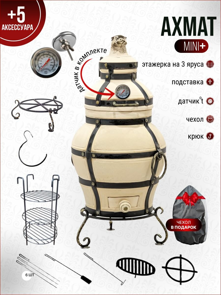Ахмат с откидной крышкой - Комплект "Mini+" - тандыр маленький с термометром (требует установки)- 30 л, Технокерамика. интересное: