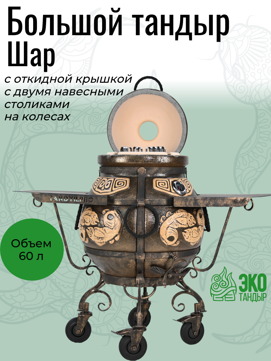Купить Тандыр ЭкоТандыр Шар с откидной крышкой, с 2-мя навесными столиками, на колесах, цвет черная патина