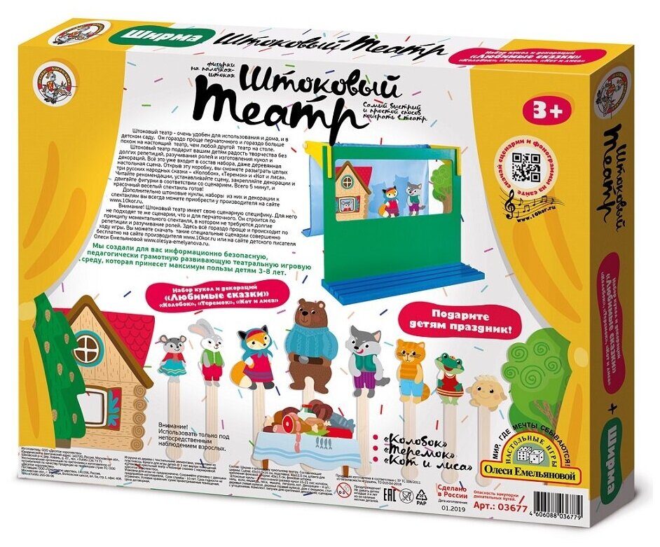 Кукольный театр "Любимые сказки: Колобок, Теремок, Кот и лиса" штоковый с ширмой Десятое Королевство 03677 интересное: