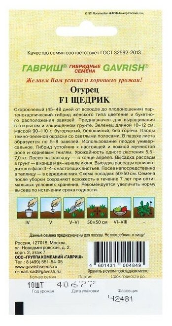 Семена Огурец Щедрик F1 скороспелый, партенокарпический 10шт/1