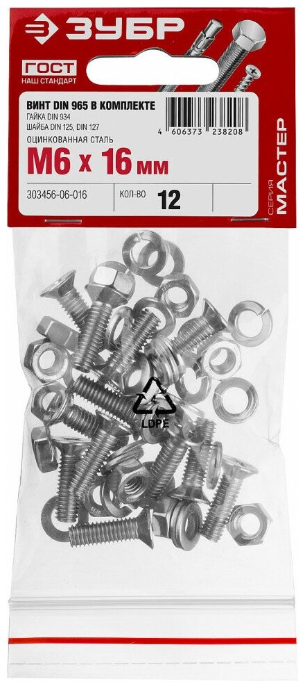 ЗУБР DIN 965 M6 x 16 мм, винт с гайкой и шайбами, 12 шт (303456-06-016)
