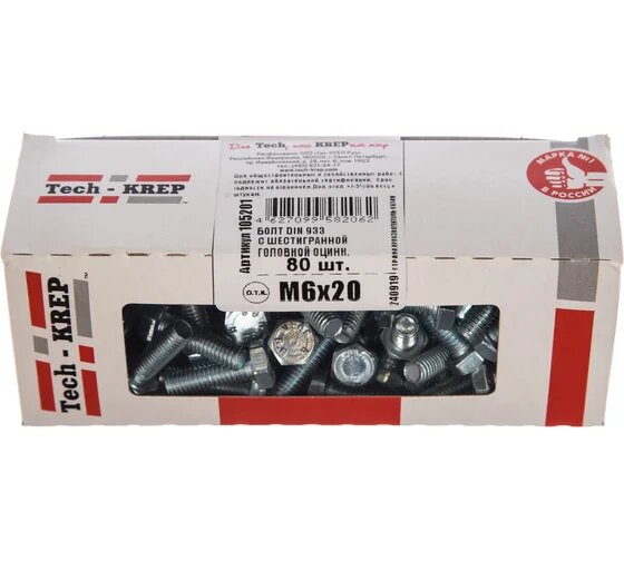 Купить Tech-Krep Болт DIN933 с шестигранной головкой оцинк. М6x20 80 шт - коробка с ок. Tech-Kr 105201