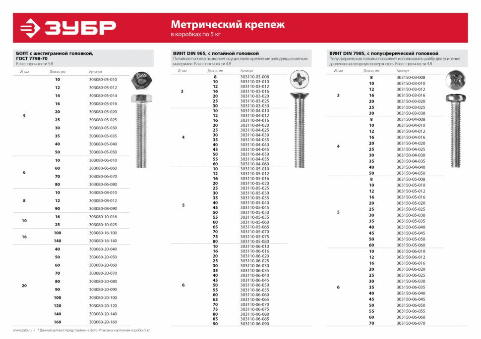 Болты DIN 933 с шестигранной головкой, коробка 5 кг, серия мастер Зубр 303080-12-100
