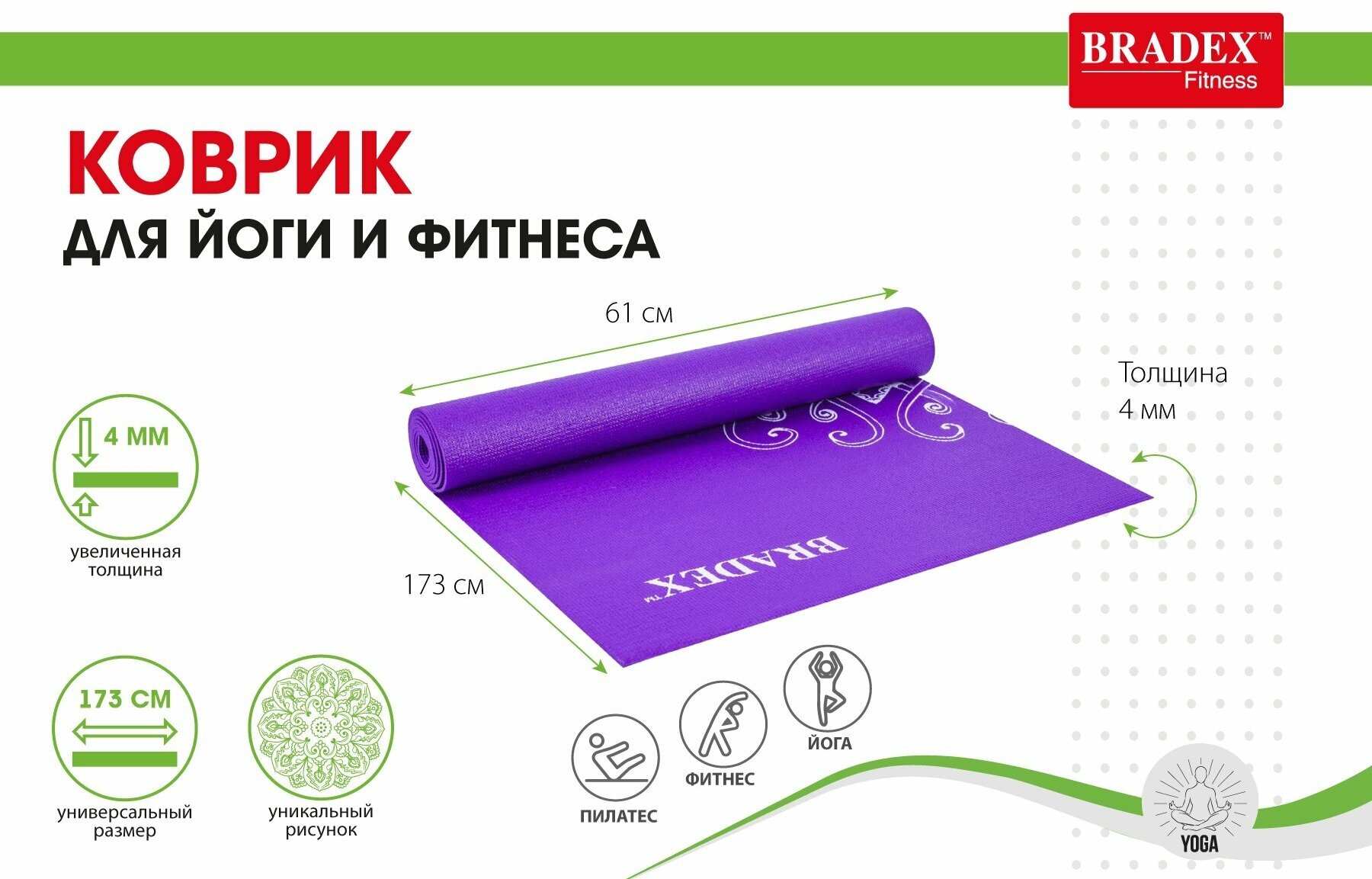 Коврик для йоги и фитнеса с рисунком Виолет, Bradex (товары для спорта и отдыха, 173 х 61 х 0,4, SF 0405)