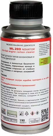 LAVR / ln2506 / Раскоксовывание двигателя ML203 NOVATOR (для двигателей до 2-х литров) LAVR Ultra-fast engine carbon cleaner 190 мл