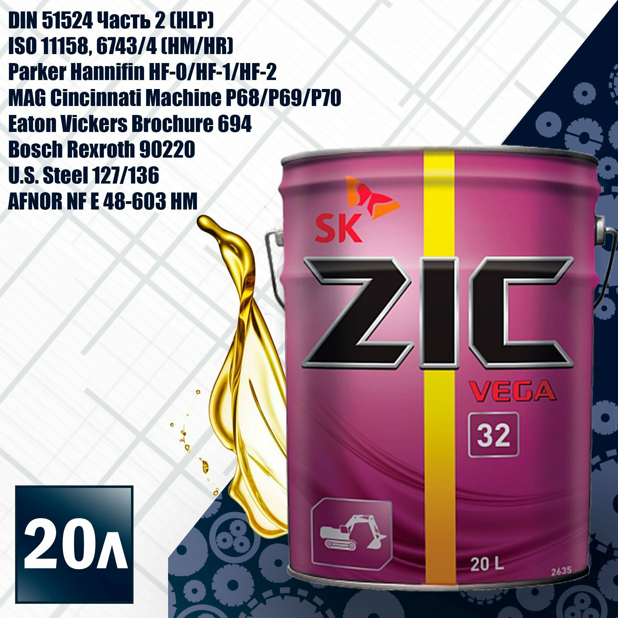 Масло Zic Vega 32, 20 Л. Din 51524 Часть 2 (Hlp), Iso 11158, 6743/4 (Hm/Hr) Zic арт. 192634