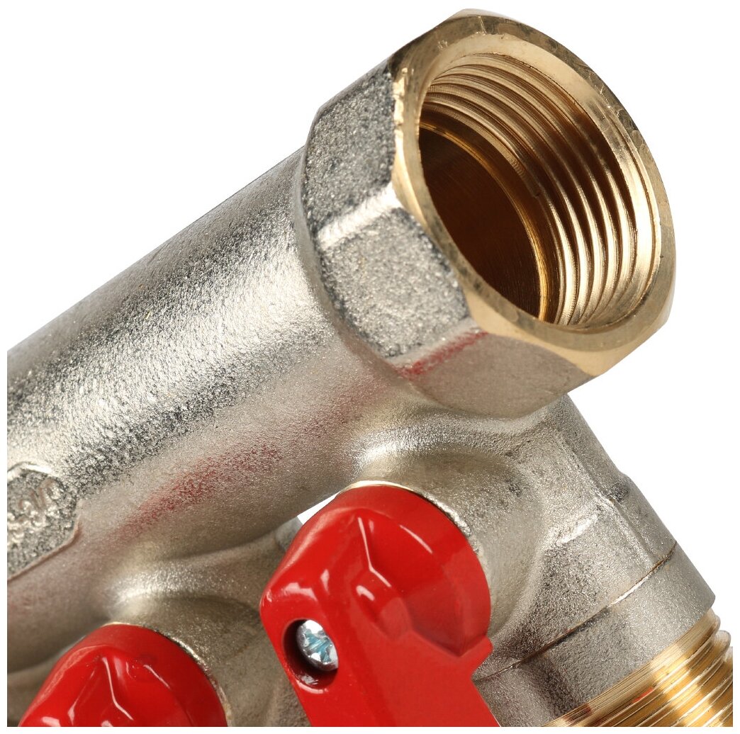 Коллектор проходной запорный STOUT (SMB 6200 341202) 3/4" НР-ВР, 2 отвода 1/2" (красные ручки)