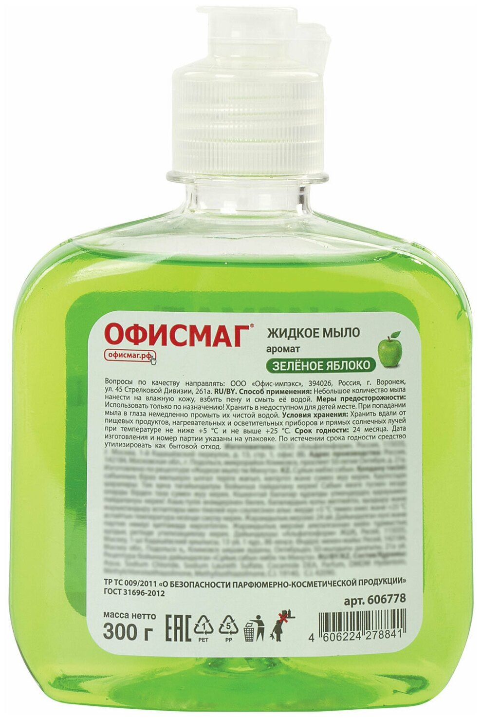 Мыло жидкое 300 г офисмаг, "Зеленое яблоко", флип топ, 606778, 606778