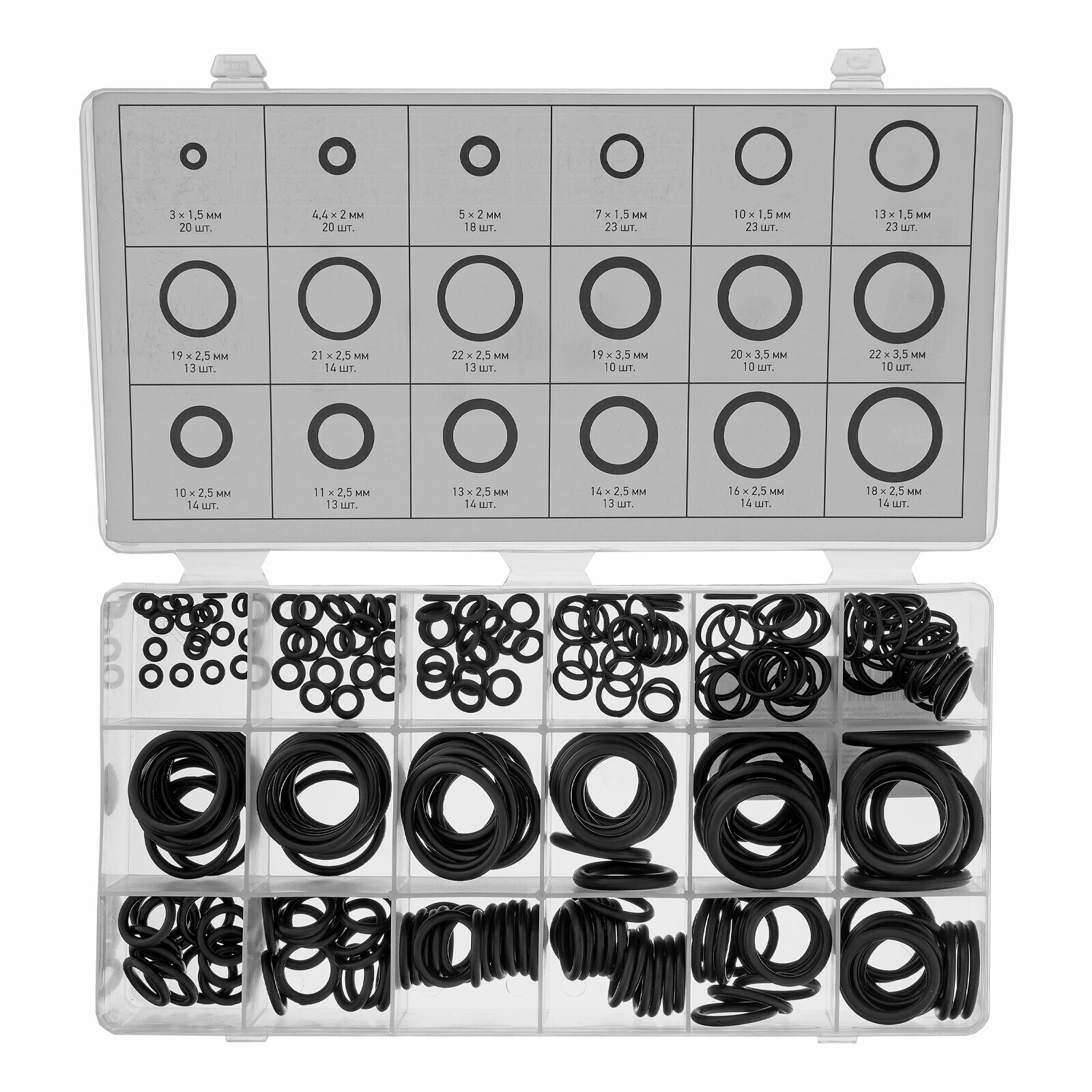 | Дополнительная информация | пластиковый кейс - 1 шт ; Резиновые уплотнители: 3х1,5 мм - 20 шт; 4,4х2 мм - 20 шт; 5х2 мм - 18 шт; 7х1,5 мм - 23 шт; 10х1,5 мм - 23 шт; 10х2,5 мм -14 шт; 11х2,5 мм -13 шт; 13х1,5 мм - 23 шт; 13х2,5 мм - 14 шт; 14х2,5 мм - 13 шт; 16х2,5 мм - 14 шт; 18х2,5 мм - 14 шт; 19х2,5 мм - 13 шт; 21х2,5 мм - 14 шт; 22х2,5 мм - 13 шт; 19х3,5 мм - 10 шт; 20х3,5 мм - 10 шт; 22х3,5 мм -10 шт |