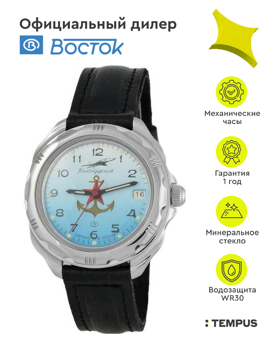 Мужские наручные часы Восток Командирские 211084-classic, натуральная кожа, черный