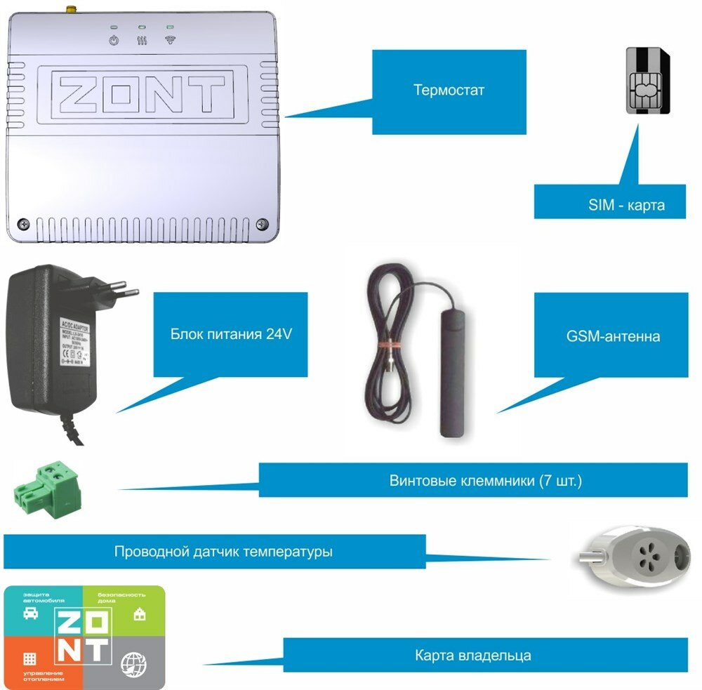 | Подробная комплектация | ZONT Smart - основной блок, блок питания 12V, GSM-антенна для усиления сигнала, проводной датчик температуры DS18S20, батарея резервного питания, клеммники винтовые (5 шт.), SIM-карта, карта владельца. |