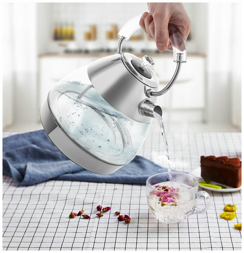 | Плюсы: | Чайник очень красивый, в реальности намного интереснее. Стеклянная ручка чайника и граненая на крышке смотрятся изыскано. При кипячении по основанию чайника загорается, приятным голубоватым цветом, подсветка. При наливании воды ручка не мешает. Достойное украшение кухни, рекомендую. |