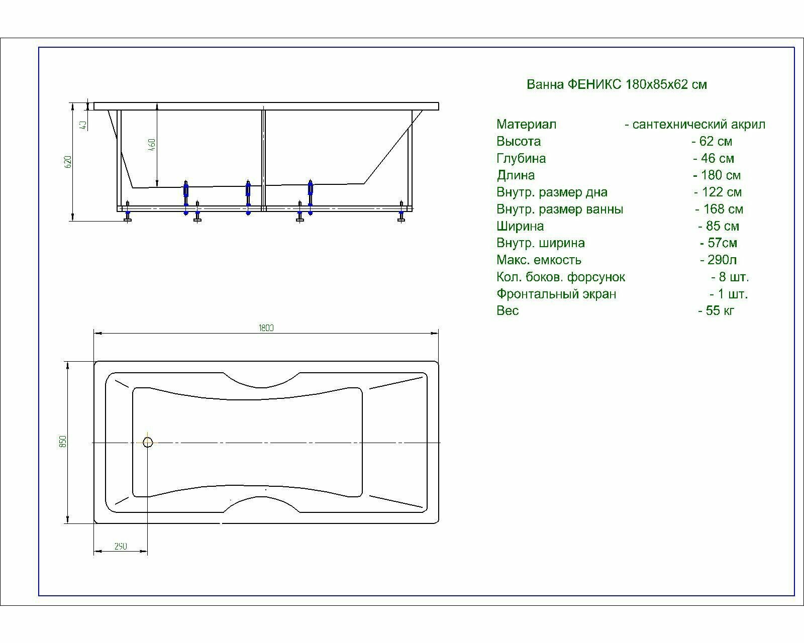 Ванна АКВАТЕК Феникс 180х85 без гидромассажа, фронтальная панель, каркас, слив