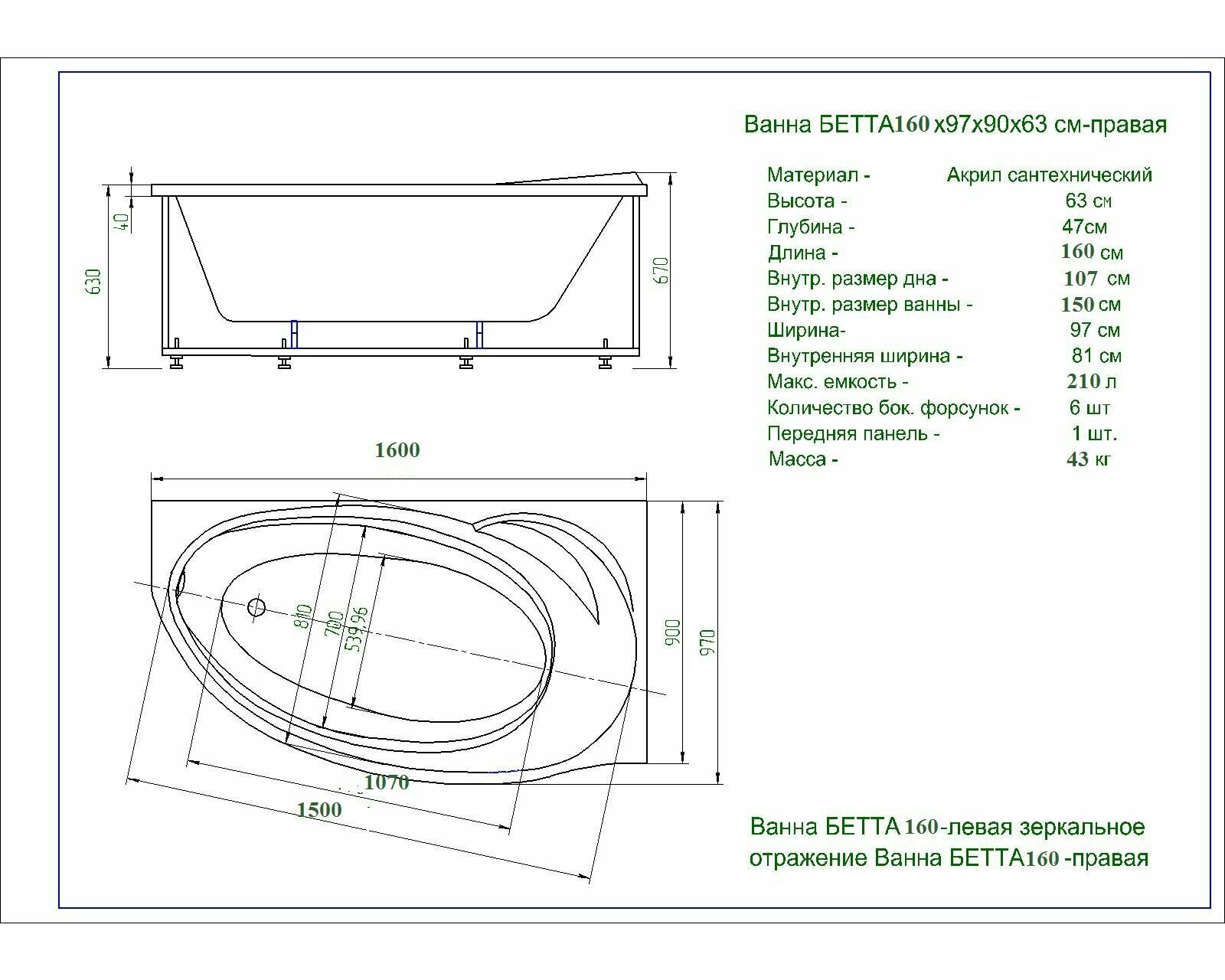 | Дополнительная информация | правосторонняя; каркас, слив-перелив, фронтальная панель в комплекте |