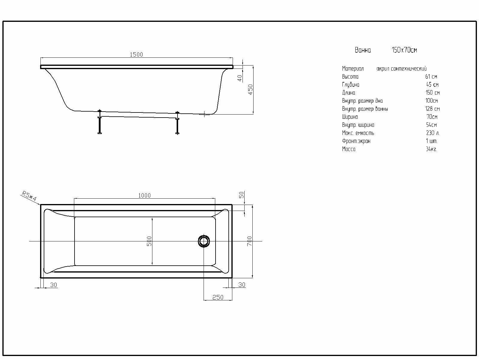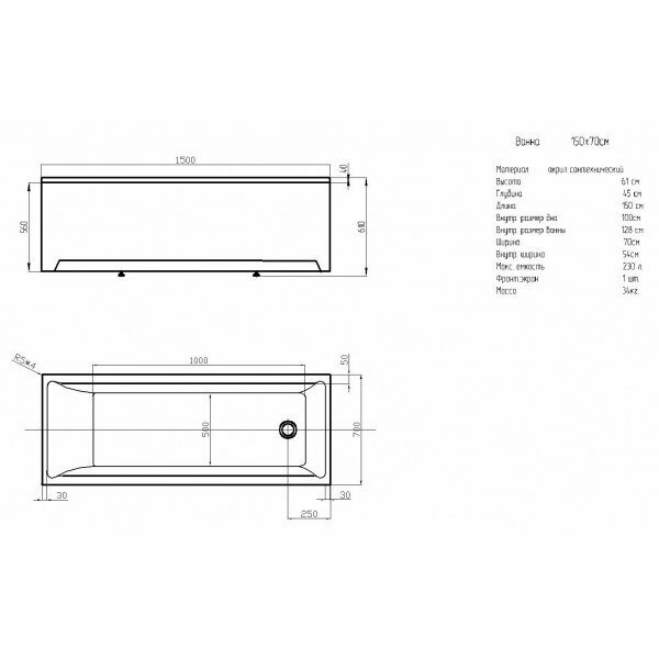 Ванна акриловая прямоугольная АКВАТЕК Лайма 150х70 LAI150-0000001