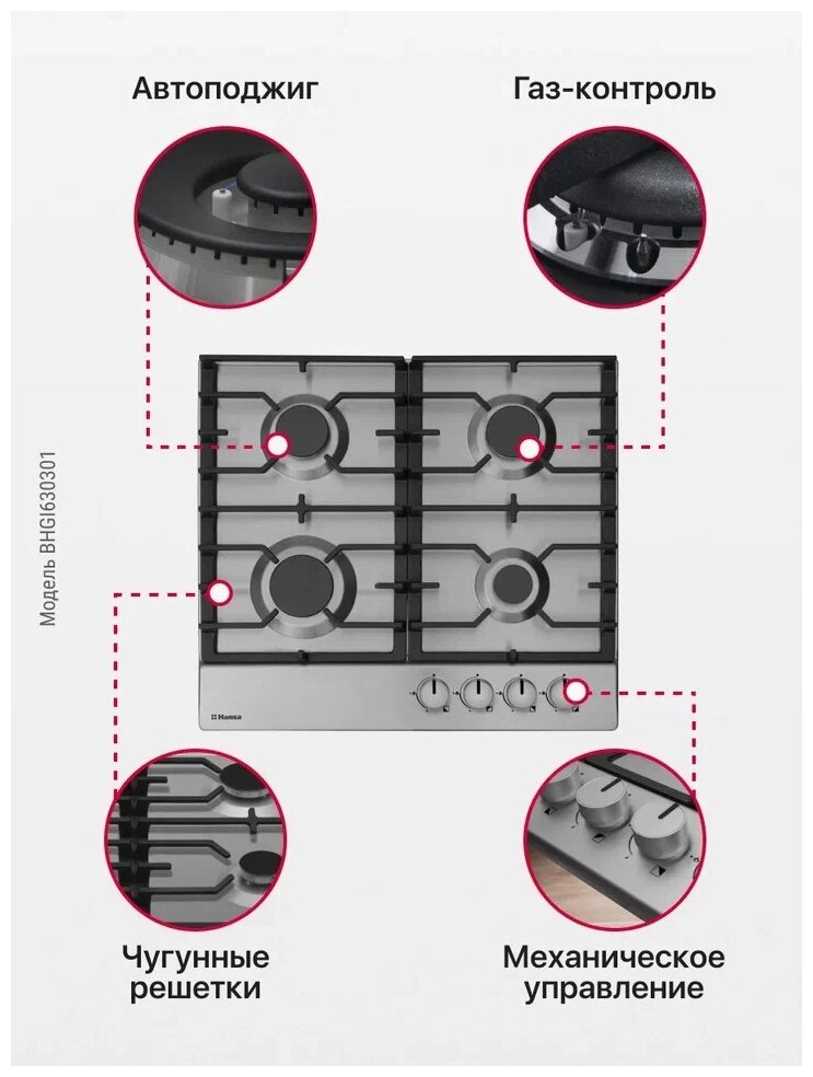 Газовая варочная панель Hansa BHGI630301, встраиваемая, 60 см, газ-контроль и автоподжиг на всех конфорках, чугунные решетки, нержавеющая сталь