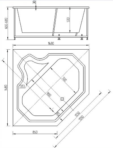 Акриловая ванна Aquatek Лира 148x148 LIR150-0000032 без гидромассажа с фронтальной панелью с каркасом (вклеенный) со слив-переливом