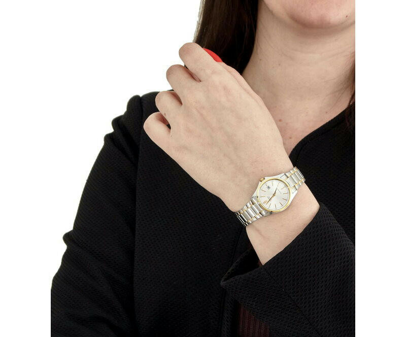 Стекло немного утоплено, это даёт минимальный объем циферблата. Мне понравилось, что они не просто металлического цвета, а с ненавязчивыми, тонкими золотыми полосками. Циферблат не огромный, но и не малюсенький, как часто бывает на женских моделях часов (примерно 2,5 см). Есть окошко с датой (это тоже не часто встречается на женских моделях). Покупкой довольна. Рекомендую! |
