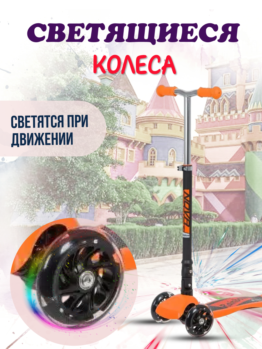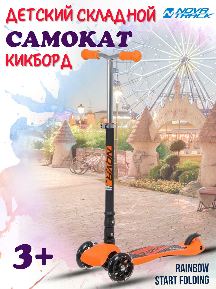 Самокат-кикборд Novatrack RainBow Start Folding, подростковый, складной, свет.колеса PU пер.120*24 задн.80*24мм,эргономичный быстросъемный Y-руль с нескладными рукоятями, регулируемый по высоте,ватер стикер, оранжевый