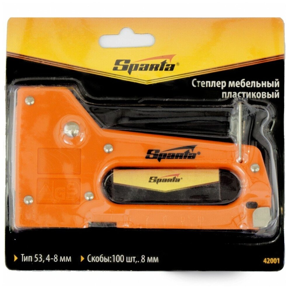 Степлер мебельный SPARTA 42001, пластиковый, со скобами 100 шт, тип скобы 53, 4-8 мм