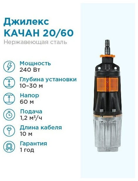 Насос колодезный ДЖИЛЕКС качан 20/60-10 - 0,24 кВт (Qmax 1,2м³/ч, Hmax 60м, кабель 10м)