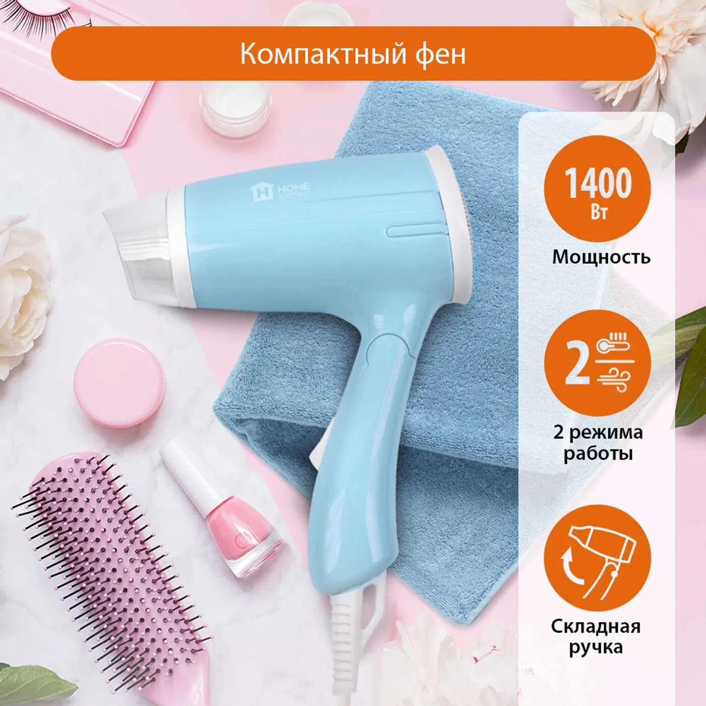 Фен для волос HOME ELEMENT HE-HD319 1400Вт/складная ручка, голубой аквамарин
