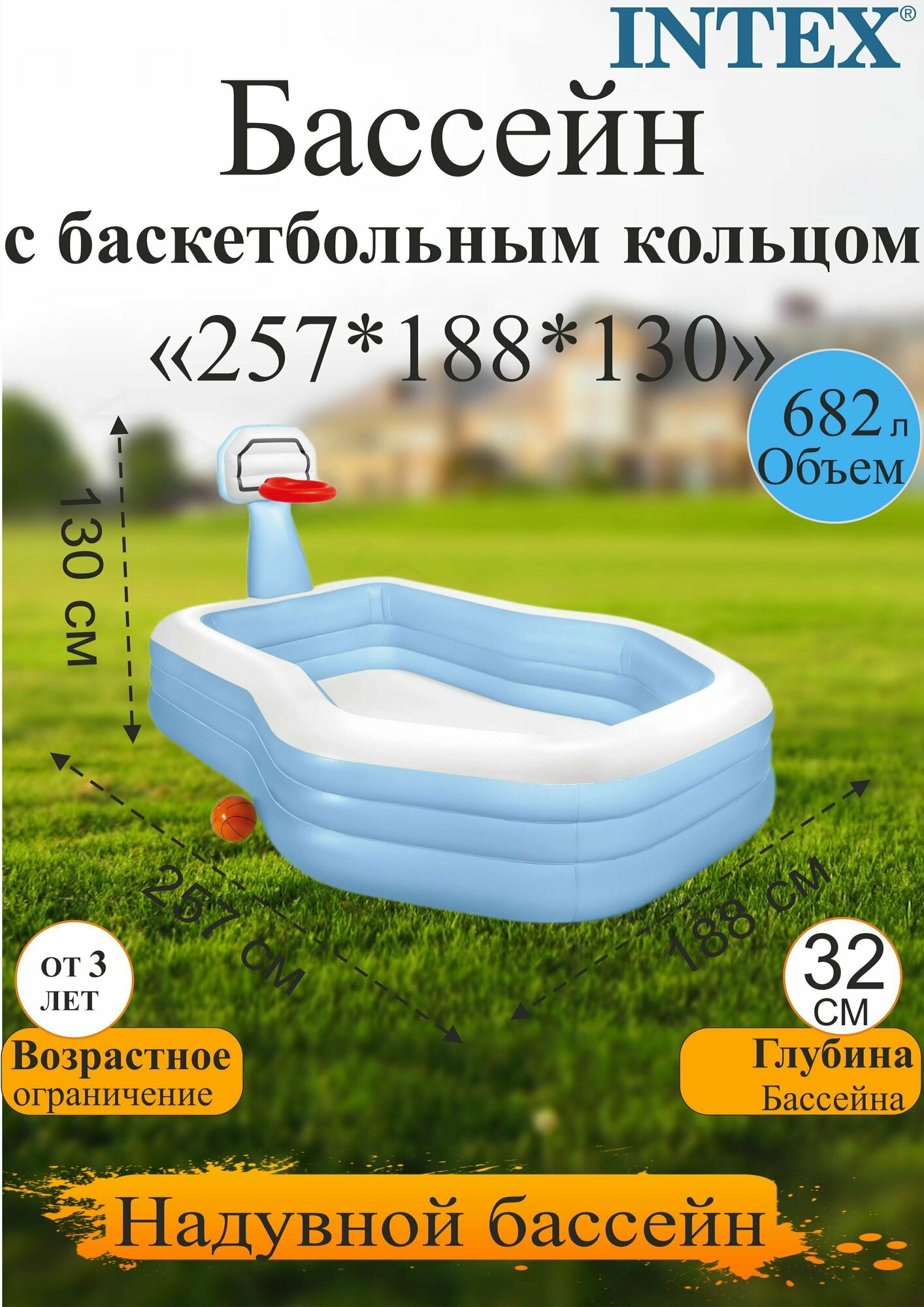 Бассейн надувной семейный с баскетбольным кольцом и надувным мячом, 257х188х135 см, 57183NP Intex