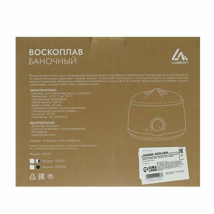 Воскоплав LuazON LVPL-07, баночный, 100 Вт, 400 г, регулировка температуры, 220 В, черный Luazon Hom .