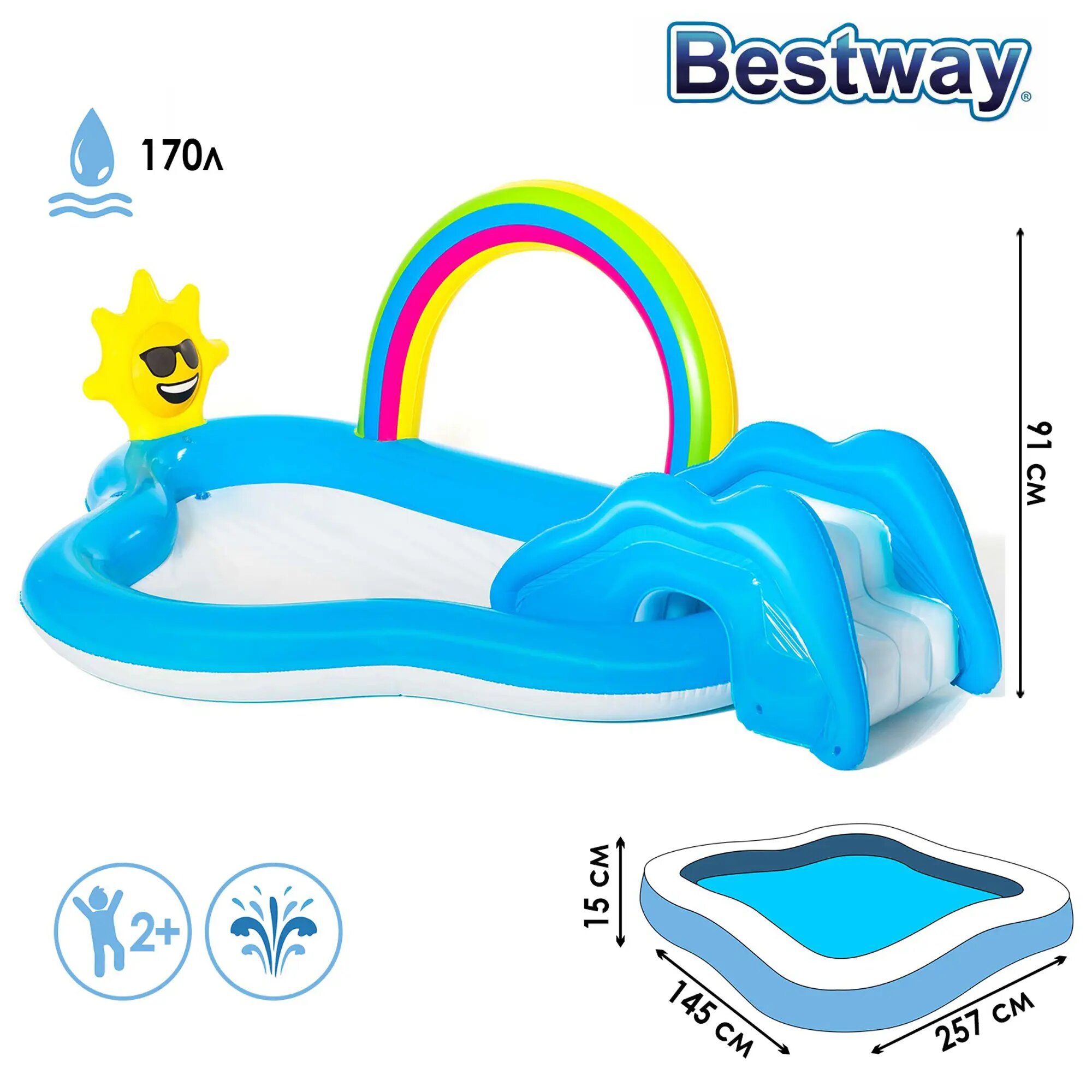 Игровой центр-бассейн Bestway, 257х745х91 см, Радуга и брызги, 53092, 170 л, с разбрызгивателем