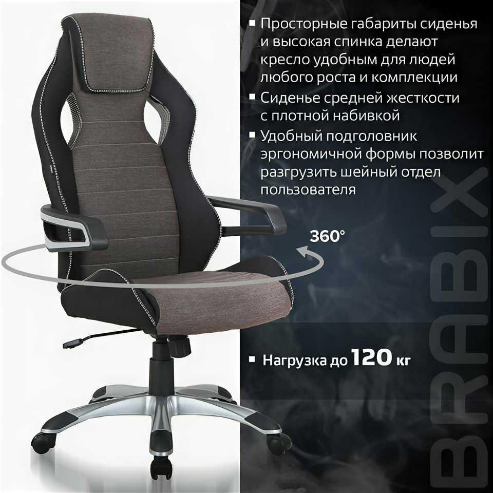 Игровое кресло для геймеров BRABIX Techno GM-002, ткань, черное/серое, вставки белые