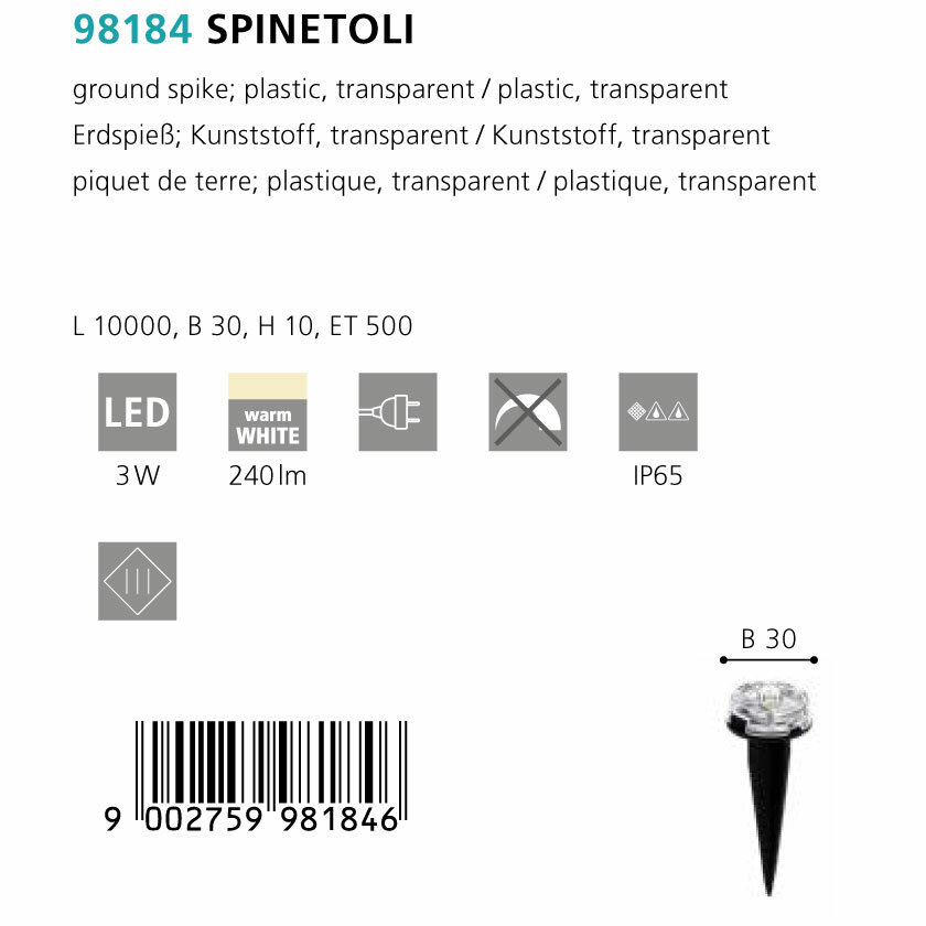 Ниже Вы можете прочитать отзывы на Ландшафтный светодиодный светильник Eglo Spinetoli 98184, ознакомится с подробными характеристиками, посмотреть интересные обзоры и фотографии на Ландшафтный светодиодный светильник Eglo Spinetoli 98184.