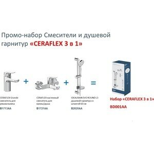 Промо набор Смесители и душевой гарнитур Ceraflex 3 в 1, Ideal Standard BD001AA (B1713AA+B1721AA+B2620AA)