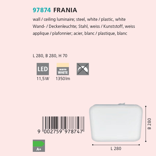Настенно-потолочный светильник EGLO Frania 97875, 14.6 Вт, кол-во ламп: 1 шт., 33 х 33 см, цвет арматуры: белый, цвет плафона: белый