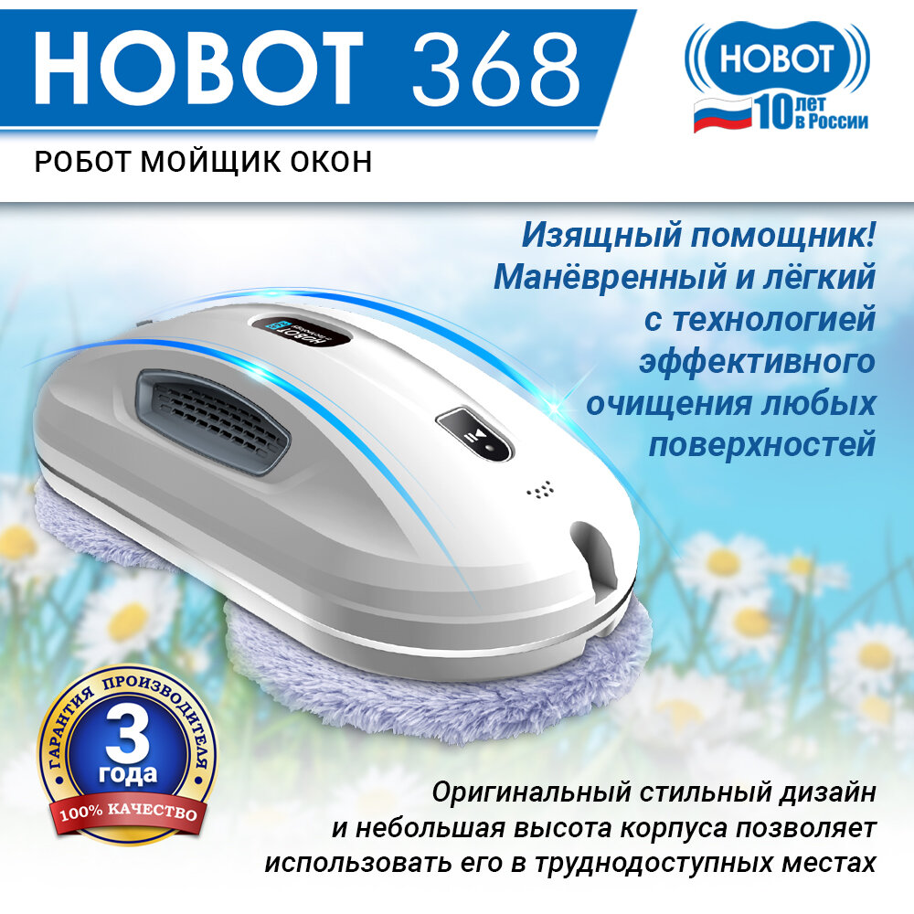 В итоге остановила свой выбор на Hobot 368. Работает быстро, в комплекте 6 пар чистящих салфеток-насадок. Но я докупила ещё 1 комплект из 6 пар салфеток, так как менять их надо сразу, как только робот 1 раз помыл 1 окно, иначе пойдут разводы от грязной салфетки. Мощный, гарантия 3 года |
