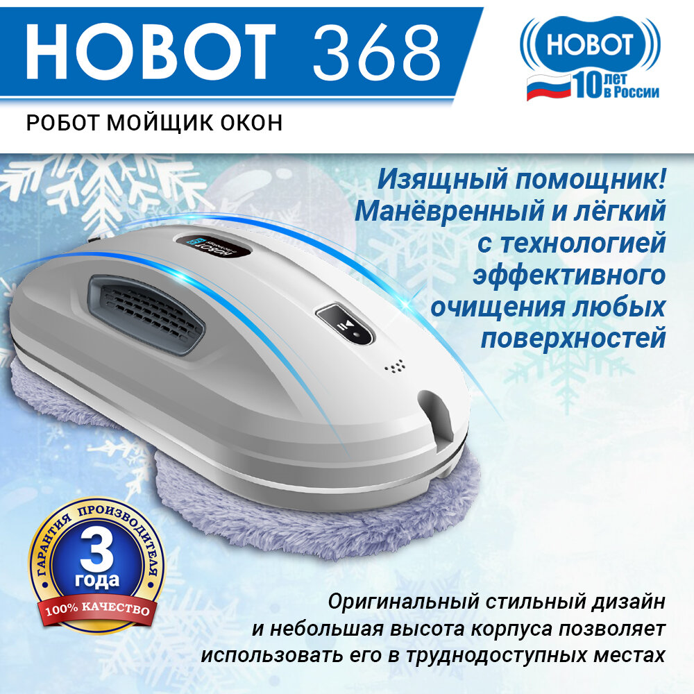 В итоге остановила свой выбор на Hobot 368. Работает быстро, в комплекте 6 пар чистящих салфеток-насадок. Но я докупила ещё 1 комплект из 6 пар салфеток, так как менять их надо сразу, как только робот 1 раз помыл 1 окно, иначе пойдут разводы от грязной салфетки. Мощный, гарантия 3 года |