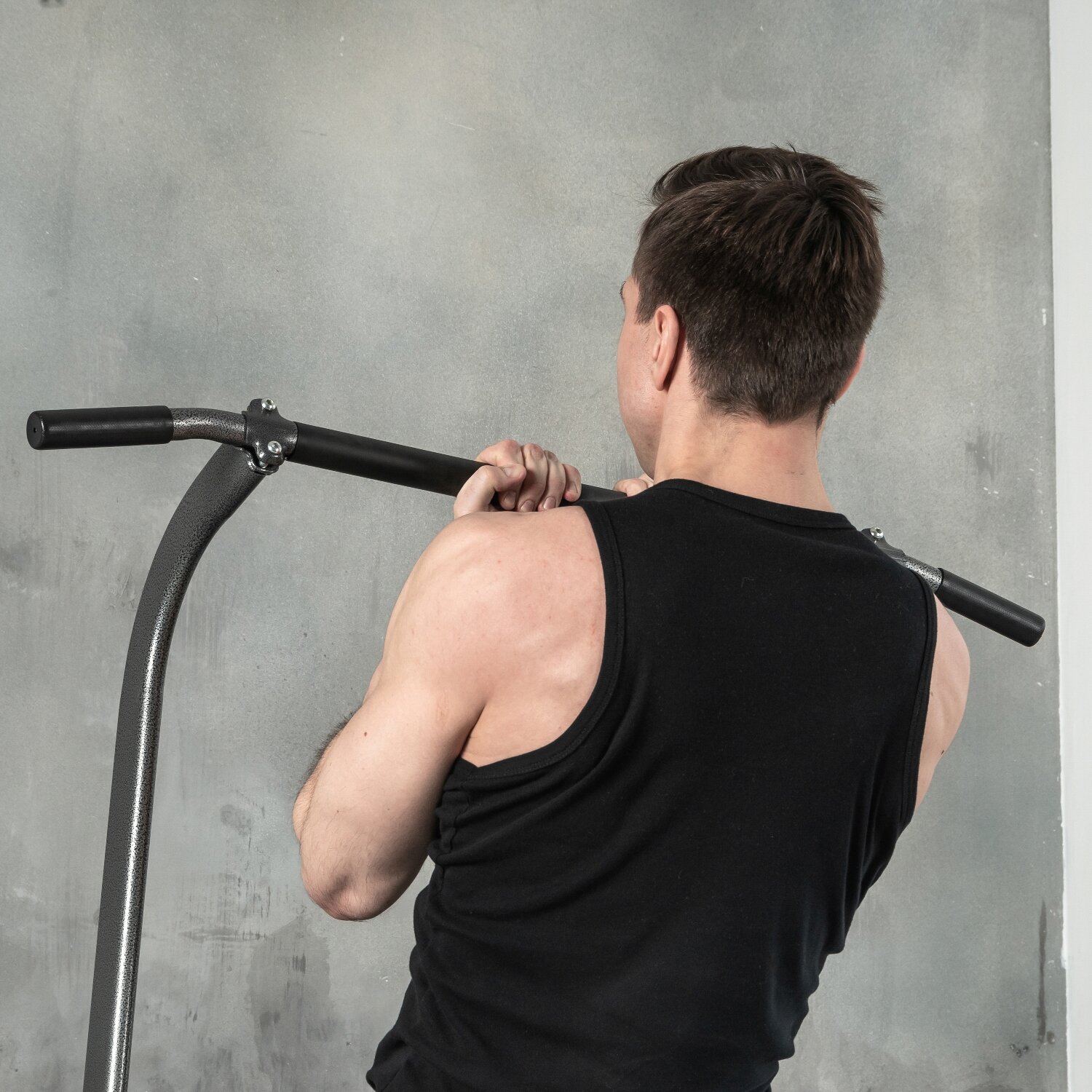 Не сильно шатается при подтягиваниях при моем весе и росте (65кг, 172) Не так много места занимает. Высота турника регулируется |