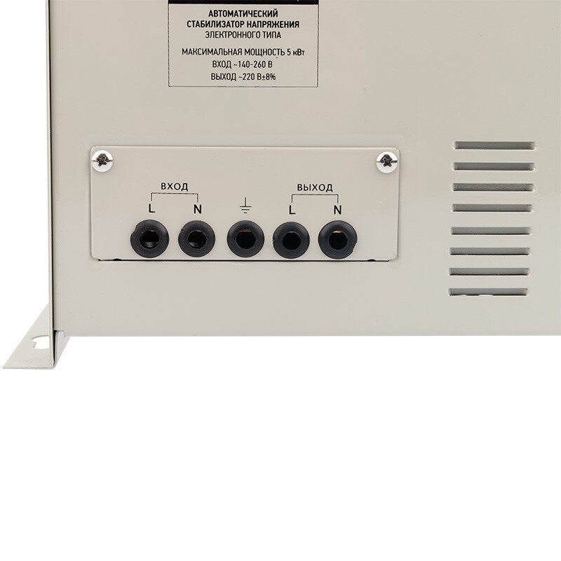 Настенный вариант. Неплохая колодка и толстые провода в самом стабе. Экран: входное и выходное напряжение. Тяжёлый. |